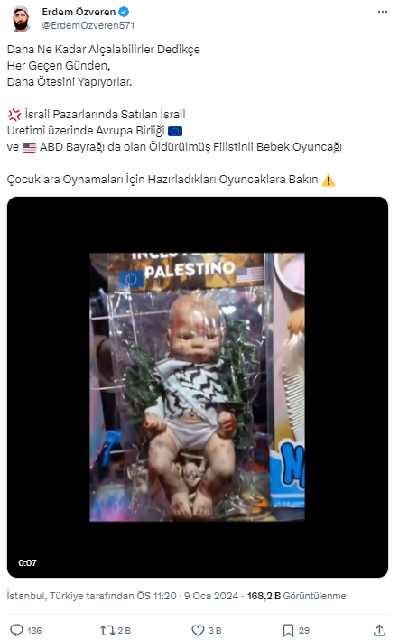 Yapılan başka sosyal medya paylaşımlarında ise videonun İsrail’de yaralı Filistinli oyuncak bebeğin tasarlanıp satışta olduğu öne sürüldü. Ayrıca videodaki paketin üstünde İsrail, ABD ve AB bayraklarının da yer aldığı görülüyor.