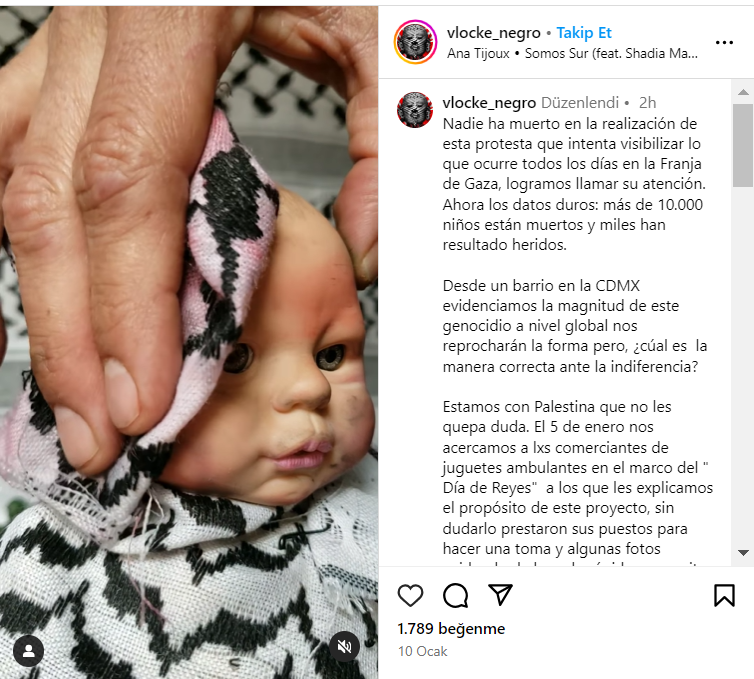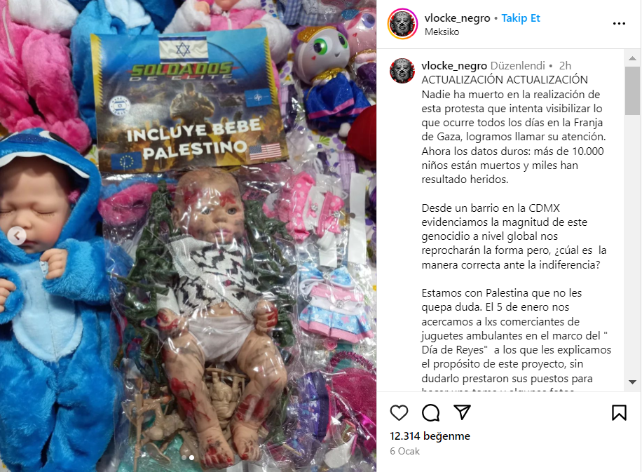 Öncelikle oyuncak bebek paketinin üzerinde büyük yazılarla İspanyolca: “INCLUYE BEBE PALESTINO” yazısı dikkat çekiyor. Bu yazı, “Filistinli bebek içerir” anlamına geliyor. Meksika’da sanatçı ve aktivist olduğunu öğrendiğimiz Vlocke Negro, tasarladığı bu yaralı oyuncak bebekle Filistin halkına destek olduğunu göstermeyi amaçlamış. 6 Ocak 2024 tarihinde yapılan paylaşımda, “Filistin’in yanındayız, 5 Ocak’ta “Kral Günü” kapsamında bu projenin amacını anlattığımız sokak satıcılarına başvurduk, tezgahlarını hiç tereddüt etmeden ödünç vererek fotoğraf çekmemize izin verdiler” ifadelerinin yer aldığı bir açıklama yapmış.