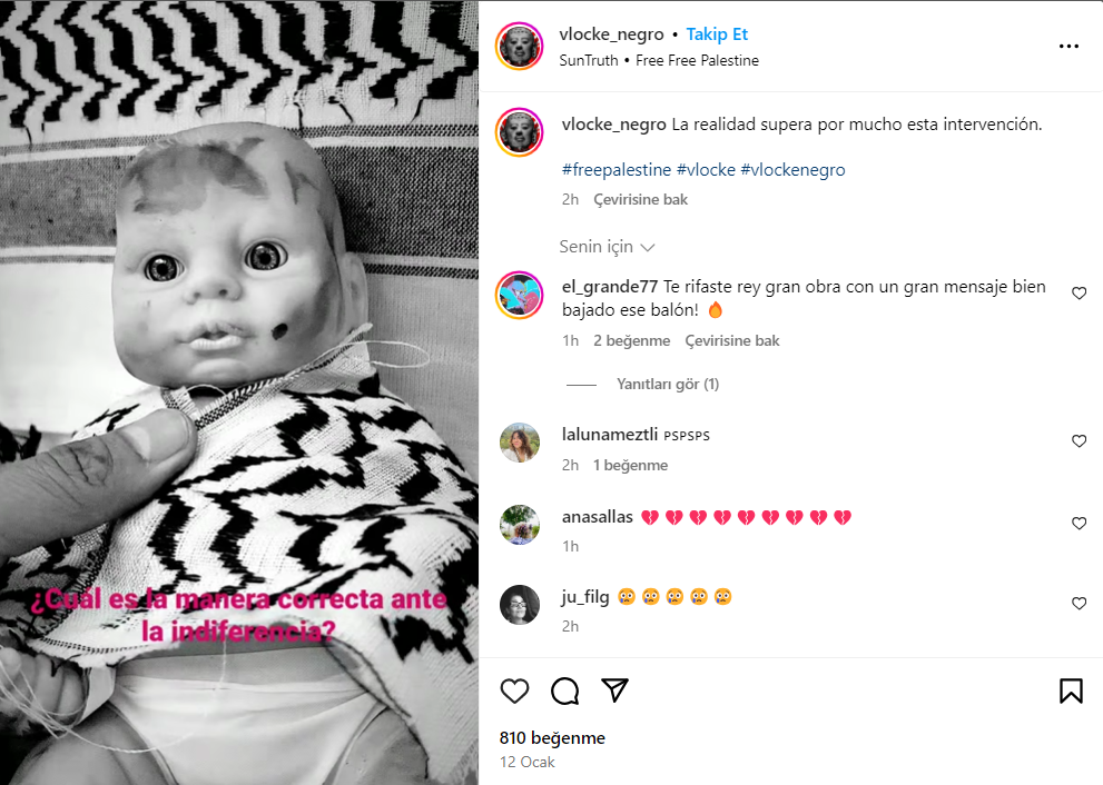 - Oyuncak bebek Filistin’de öldürülen çocuklara dikkat çekmek ve farkındalık yaratmak amacıyla Vlocke Negro kullanıcı adını kullanan, Meksikalı sanatçı tarafından üretilmiş.