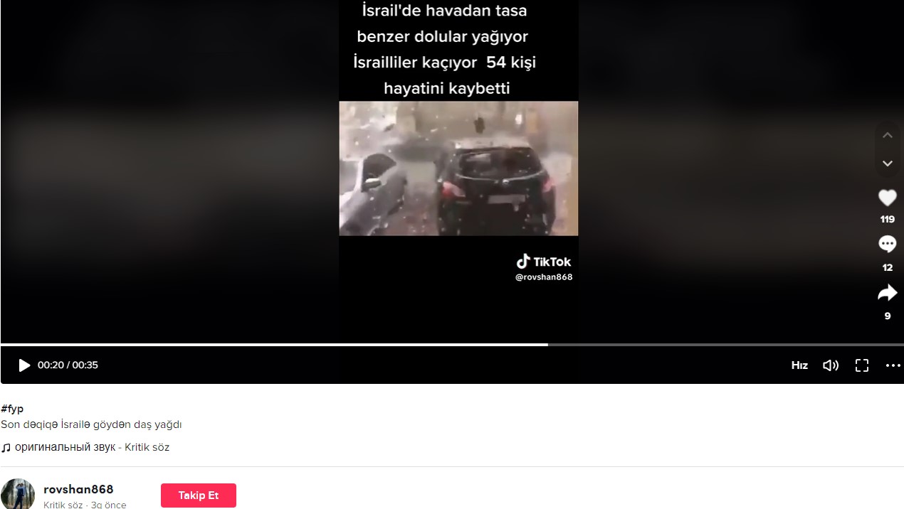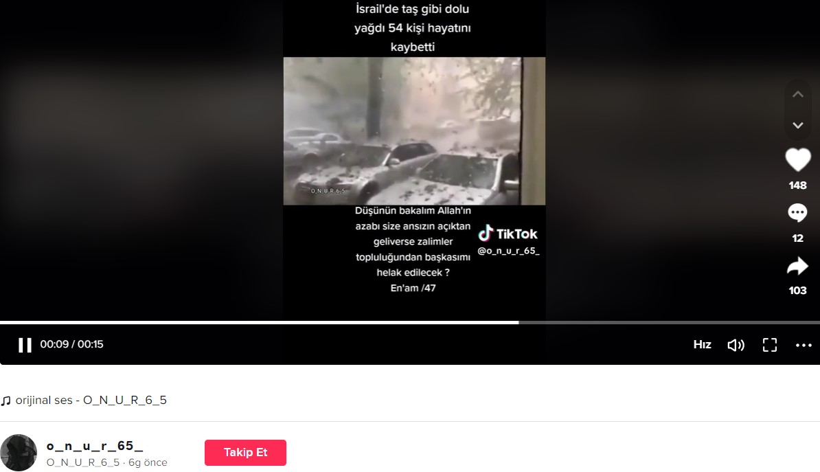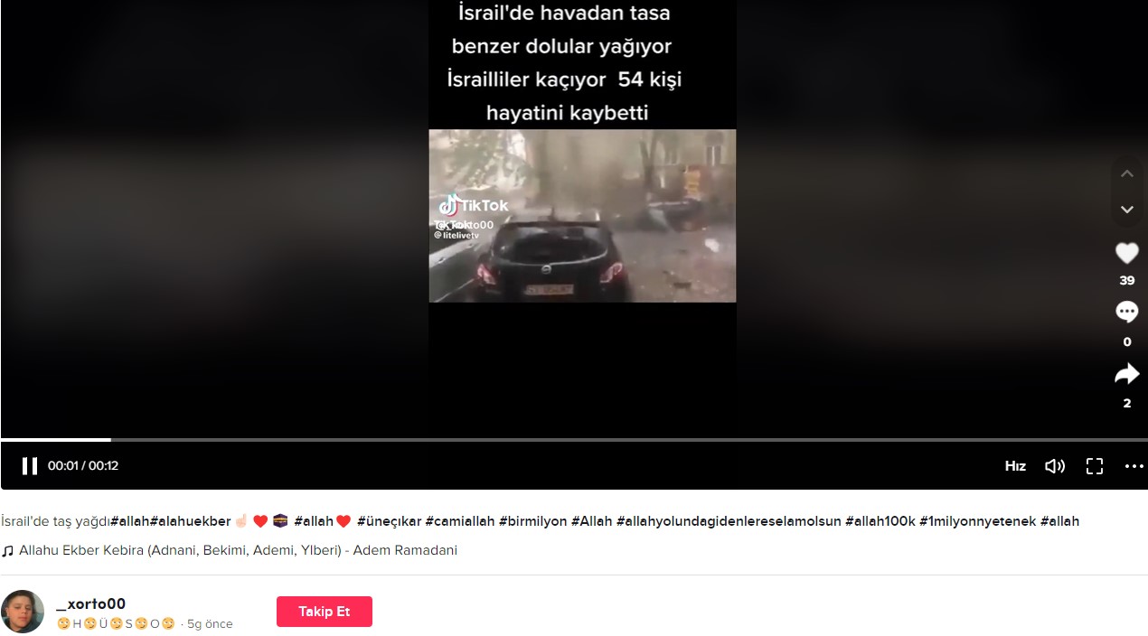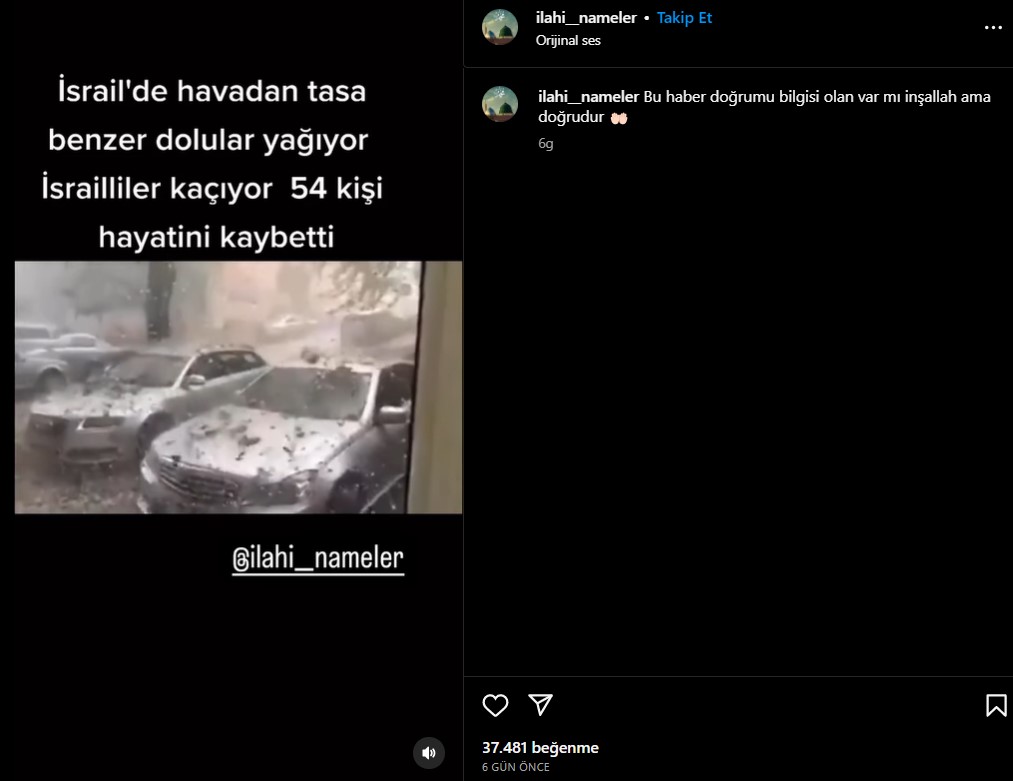 Sonuç olarak videonun İsrail’de taşa benzer dolu yağdığını gösterdiği an iddiasıyla paylaşılan görüntüler gerçeği yansıtmıyor. Söz konusu görüntüler, hatalı ilişkilendirilerek sosyal medya platformlarında yayılmış.