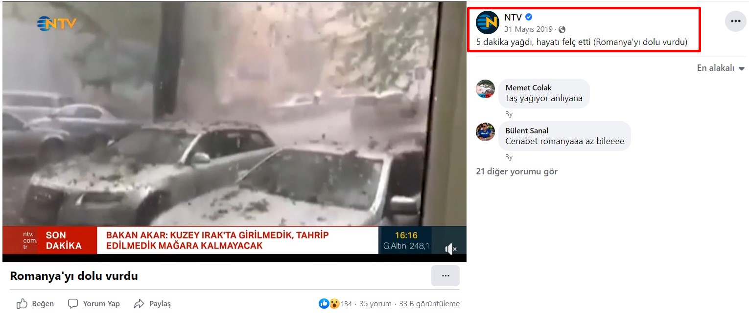 Taş yağmuru olduğu iddiasıyla paylaşılan videonun aslında, Romanya Zalau’da meydana gelen şiddetli rüzgar ve dolu yağışını gösterdiğini anlıyoruz. Ayrıca haber kaynaklarında yaklaşık olarak 15 dakika sürdüğü belirtilen yağış; binalarda, evlerde ve araçlarda maddi hasara yol açtığı ifade edilmiş.