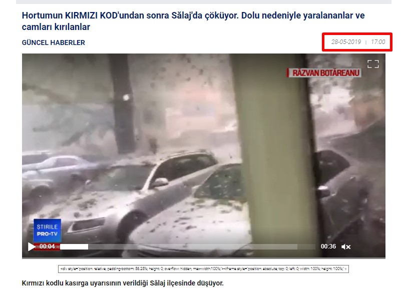 Buna ek olarak iddiaya konu olan videonun haber kaynaklarından, Răzvan Botăreanu tarafından kaydedildiği bilgisine de ulaşıyoruz. Video, 28 Mayıs 2019’da Romanya’nın Zalau kentinde yaşanan şiddetli rüzgar ve dolu yağışı sebebiyle zarar gören bina parçalarının arabaların üzerine düştüğü anı gösteriyor.