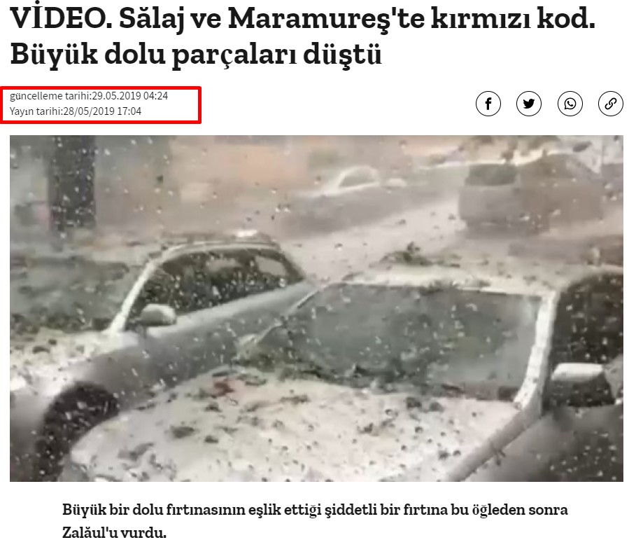 Romanya’da yaşandığını öğrendiğimiz olaya dair ulaştığımız sonuçlarda, 2019 yılında basına yansıyan haberleri görüyoruz. Türkiye ve yabancı kaynaklı basında görülen görüntülerde, Romanya’da meydana gelen şiddetli dolu yağışı ve fırtına sırasında dolu yağışından zarar gören binalardaki çatı parçalarının park halindeki araçların üzerine düştüğü belirtilmiş. Olay görüntülerinin 2019’da Romanya yerel basınında da yer aldığını görülüyor. Yıkıcı hava olayıyla ilgili Zalau Belediyesi tarafından yapılan açıklamada, 2453 araç, 19 eğitim kurumu binası, 34 kamu binası ve 554 özel binanın hasar gördüğü ifadesine yer verilmiş.