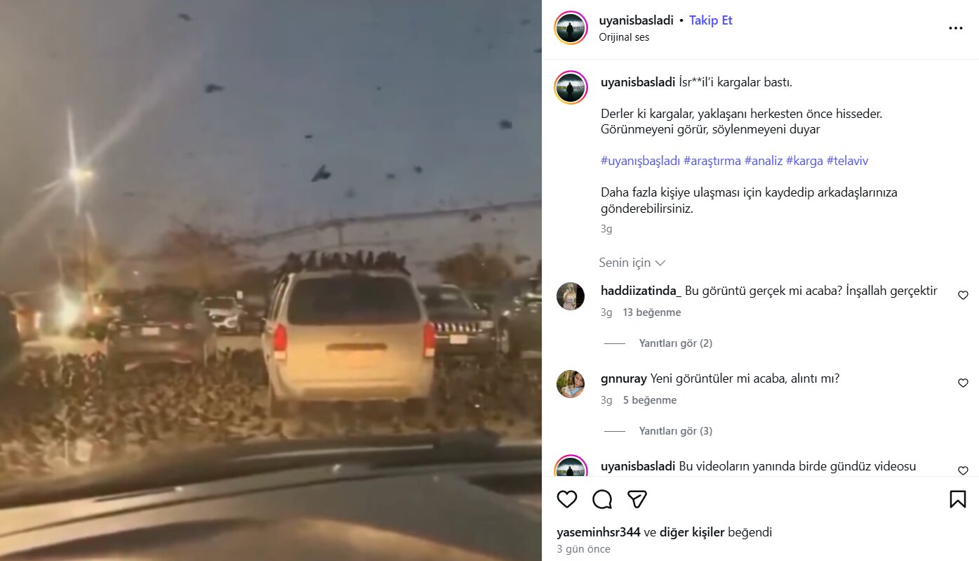 Görüntülerdeki detaylar da iddiayı desteklemiyor. Araç plakalarının ABD formatında olması ve çevresel unsurların İsrail şehirleriyle uyuşmaması, videonun Tel Aviv gibi bir şehirde çekilmediğini gösteriyor. Sosyal medyada aynı dönemde İsrail’den olduğu belirtilen ve yoğun kuş sürülerini gösteren başka videolar da dolaşıma girmiş olsa da bunlar bu görüntülerle bağlantılı değil.