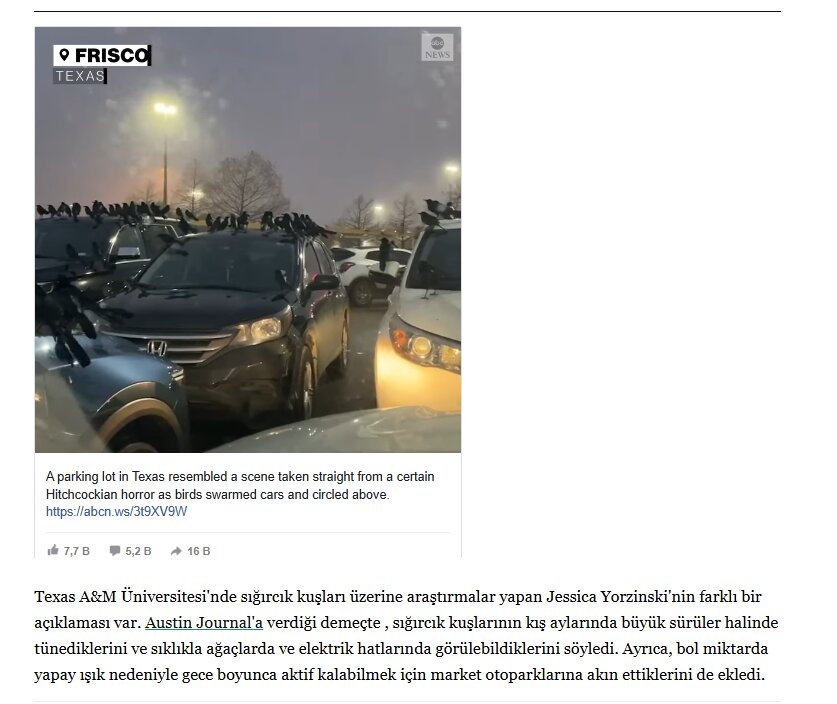 Anlaşılacağı üzere videoda görülen durum aslında olağan dışı bir olay değil. Texas eyaletinde kuşların büyük sürüler halinde özellikle market otoparkları gibi yiyecek artığının bol olduğu alanlarda toplanması oldukça yaygın bir doğa olayı. Bu nedenle görüntüler ilk bakışta çarpıcı görünse de bir “istila” ya da sıra dışı bir durum olarak değerlendirilmiyor.