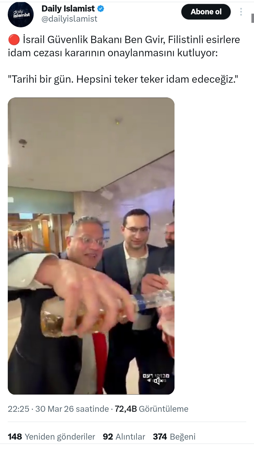 Sosyal medyada paylaşılan bir videoda, İsrail’de Filistinlileri hedef aldığı öne sürülen idam cezası yasasının kabul edilmesinin ardından, aralarında İsrail Ulusal Güvenlik Bakanı’nın da bulunduğu yetkililerin kadeh kaldırarak kutlama yaptığı iddia edildi. Paylaşımlarda ayrıca bazı yetkililerin “idam ipi rozetleri” taktığı öne sürüldü.