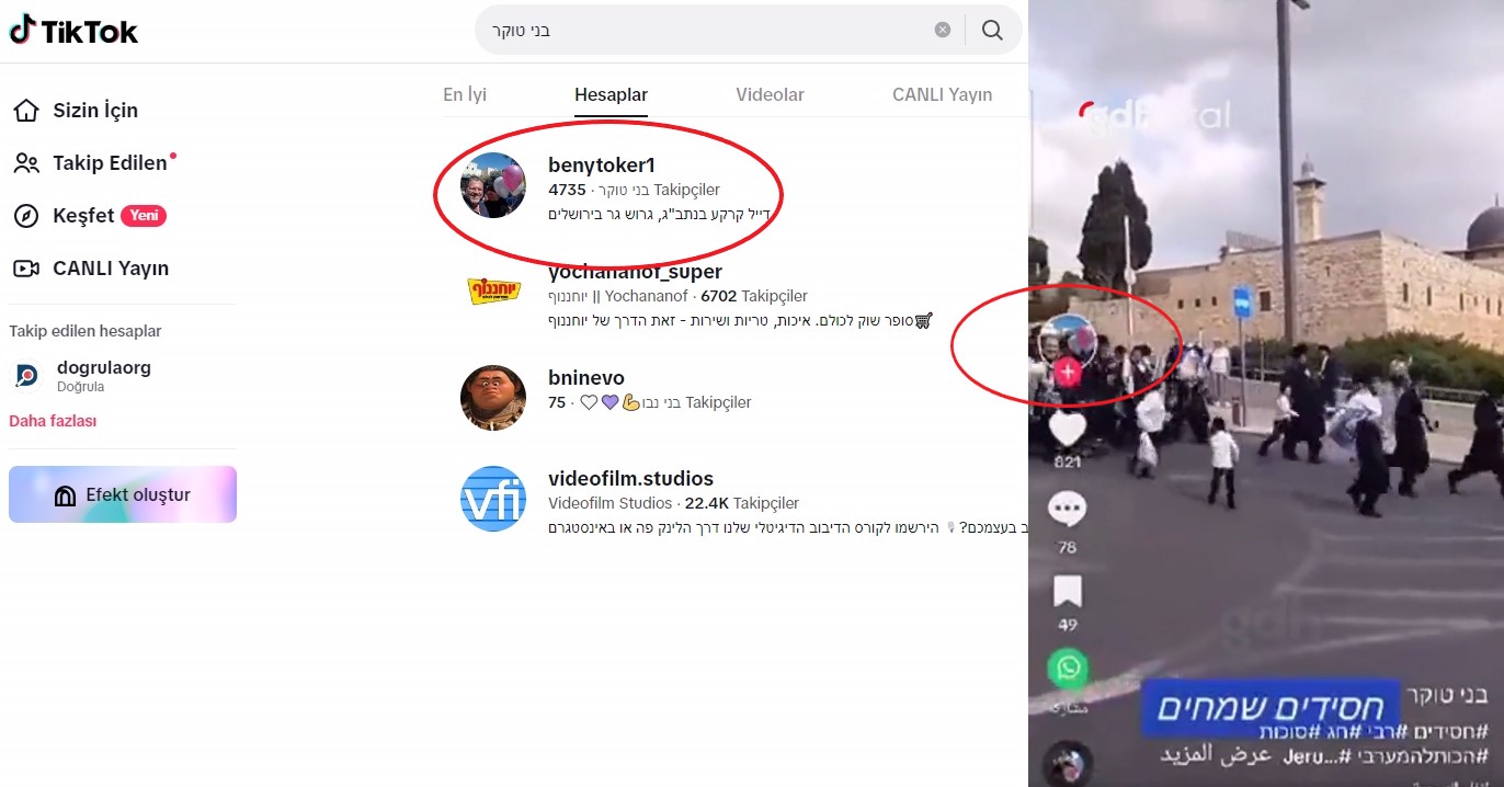 İbranice bilmesek bile videodan aldığımız ekran görüntüsünde kırmızı çemberle işaretlediğimiz yerde TikTok kullanıcı isimlerinin yazdığını biliyoruz. Google Çeviri üzerinden bu sefer ismi orijinal alfabesiyle kopyalıyoruz. Karşılığı şu şekilde: בני טוקר.