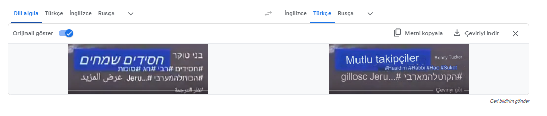 Sonrasında İbranice olduğunu gördüğümüz paylaşım için Google Çeviri’den yardım alıyoruz. Videodan aldığımız ekran görüntüsünü ‘Görsel ile Çevir’ özelliğini kullanarak Türkçe’ye çevirdiğimizde ‘Mutlu takipçiler’, ‘Sukot’, ‘Hac’ gibi iddiayla çok da alakalı olmayan kelimeler karşımıza çıkıyor.