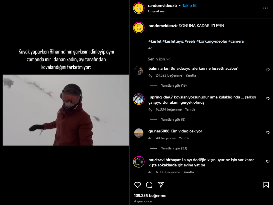 Geçmiş yıllarda da sosyal medyada çok kez paylaşılan video ile kayak yaparken şarkı söyleyen bir kadının ayı tarafından kovalandığı iddia ediliyor.