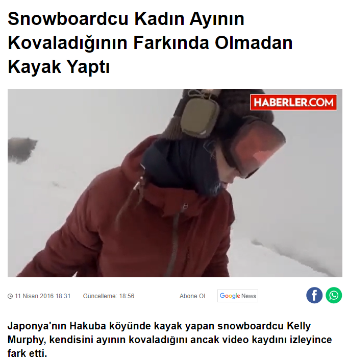 YouTube’a 11 Nisan 2016 tarihinde Kelly Murphy tarafından yüklenen video notunda, “Aman Tanrım! Kayak videolarıma göz atarken beni kovalayan bir ayı olduğunu gördüm. Az kalsın bir ayı tarafından yeniyordum. Bu video dün Japonya’daki Hakuba 47’de çekildi. Dikkatli olun millet.” yazdığı görülüyor.