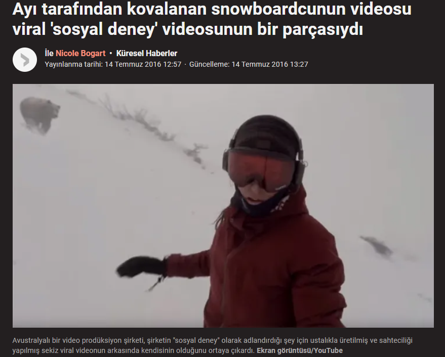 The Woolshed Company şirketinin viral içerik serisiyle ilgili açıklamasına ulaşıyoruz. Yapılan sosyal deneyle ilgili açıklamada kayak yapan kadının ayı tarafından kovalandığı iddia edilen videoyu da görmek mümkün. Dolayısıyla videonun burada da yer alması gerçek olmadığını gösteriyor.