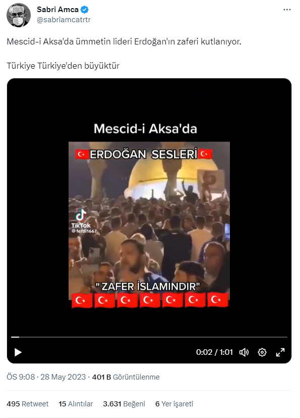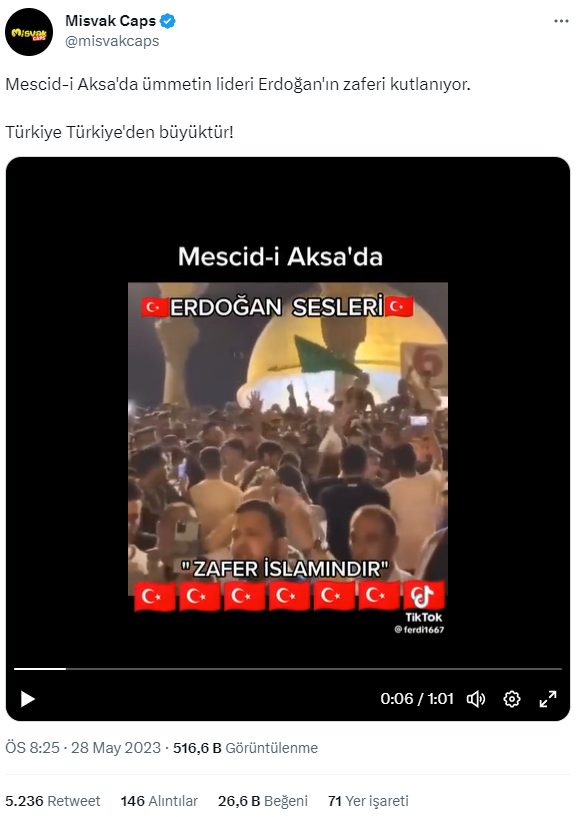 Cumhurbaşkanlığı Seçimi’nin 2. turu dün gerçekleşti. Resmi olmayan sonuçlara göre Erdoğan Türkiye’nin 13. Cumhurbaşkanı oldu. Recep Tayyip Erdoğan’ın zaferi yurt içi ve yurt dışında pek çok yerde kutlandı. Sosyal medyada da birçok kutlama videosu paylaşıldı. Bu paylaşımlar arasında Mescid-i Aksa’da çekilen bir video da bulunuyordu.