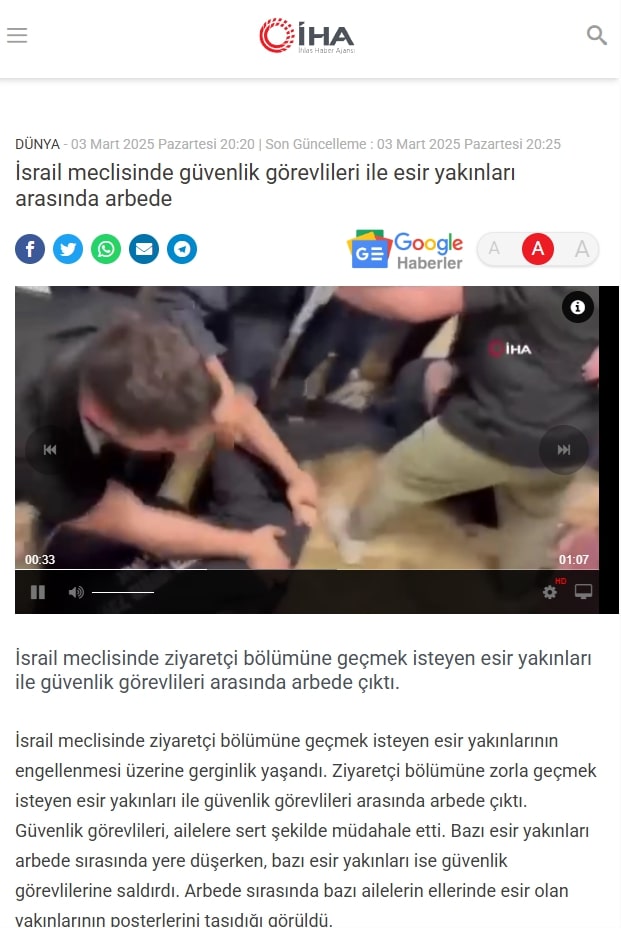 Yaşananlar Türk basınında da gündeme gelmişti. Haberlere göre Gazze’de esir olanların aileleri ve Ekim 7 saldırısı yaralıları, İsrail Meclisi’nde Başbakan Netanyahu’nun konuşmasını izlemek istediler fakat güvenlik görevlileri izin vermemiş.