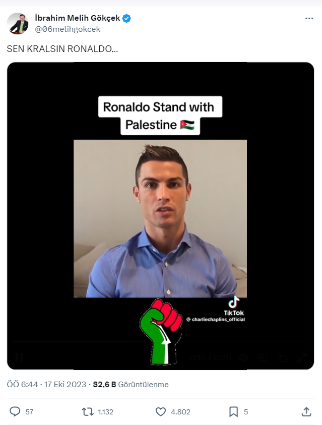 Gazze merkezli çatışmalar devam ediyor. Bu süreçte ünlü isimler de her iki tarafa da destek mesajları gönderiyor. Sosyal medyada dolaşıma giren bir video, Portekizli futbolcu Cristiano Ronaldo’nun Filistin’e desteğini açıklamak için çektiği iddiasıyla paylaşılıyor.