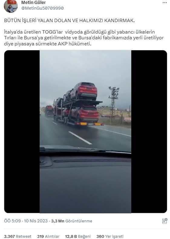 Dolayısıyla Togg’un yurt dışında üretildiği iddiasıyla yapılan paylaşımlar hatalı bir şekilde aktarılmış. Bu söylemlerin elde ettiğimiz kanıtlar doğrultusunda gerçeği yansıtmadığını söyleyebiliyoruz. Togg otomobilleri, Bursa’da üretim tesisinde üretiliyor.