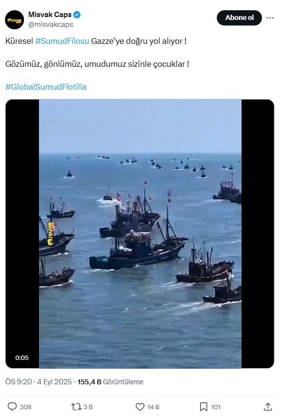Sosyal medyada dolaşıma giren bir video, Gazze’ye doğru yola çıkan Sumud Filosu’nu gösterdiği iddiasıyla paylaşılıyor.