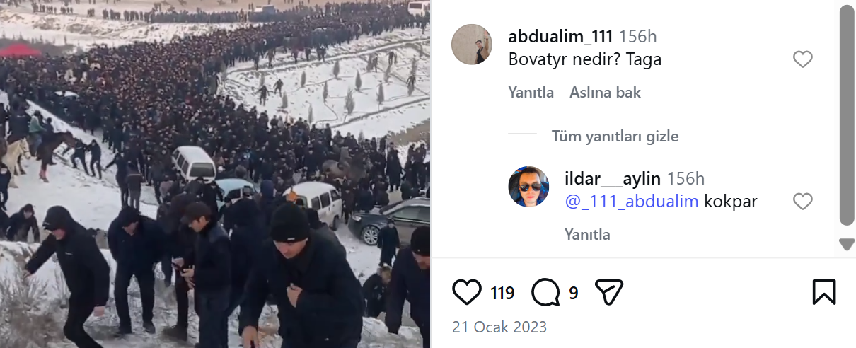 Videonun yüklendiği tarihten 1 gün önce (20 Ocak 2023) Özbekistan’da gerçekten bir Kokpar yarışı olduğuna dair YouTube videosu da bulunuyor.