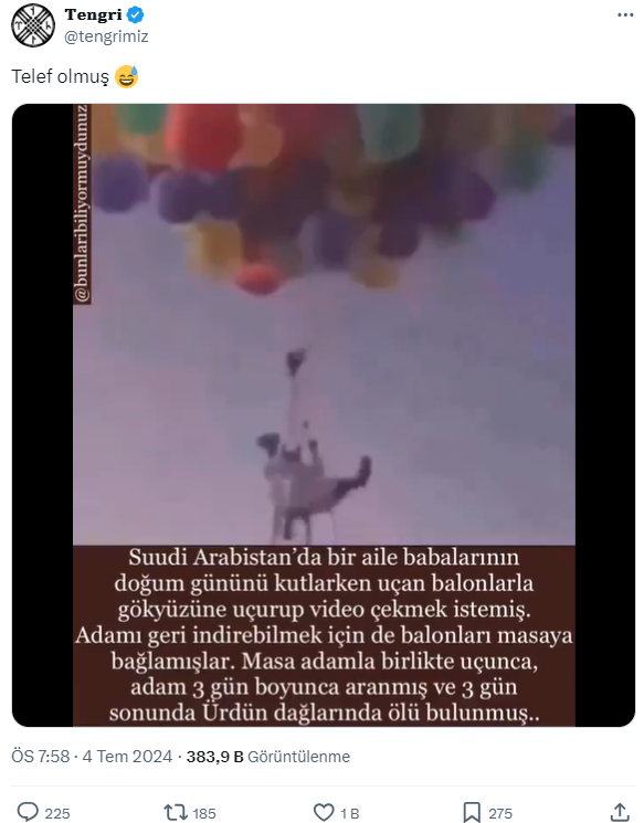 Geçtiğimiz günlerde sosyal medyada yayılan bir video ile Suudi Arabistan’da bir ailenin, babalarının doğum günü kutlaması için onu balonlara uçurdukları iddia edildi. Bu iddiaya göre, adamı geri indirmek için balonları bir masaya bağladılar, ancak adam masa ile birlikte gökyüzüne yükselerek kayboldu. Üç gün süren aramlar sonrasında ise adamın cansız bedeni Ürdün dağlarında bulundu.