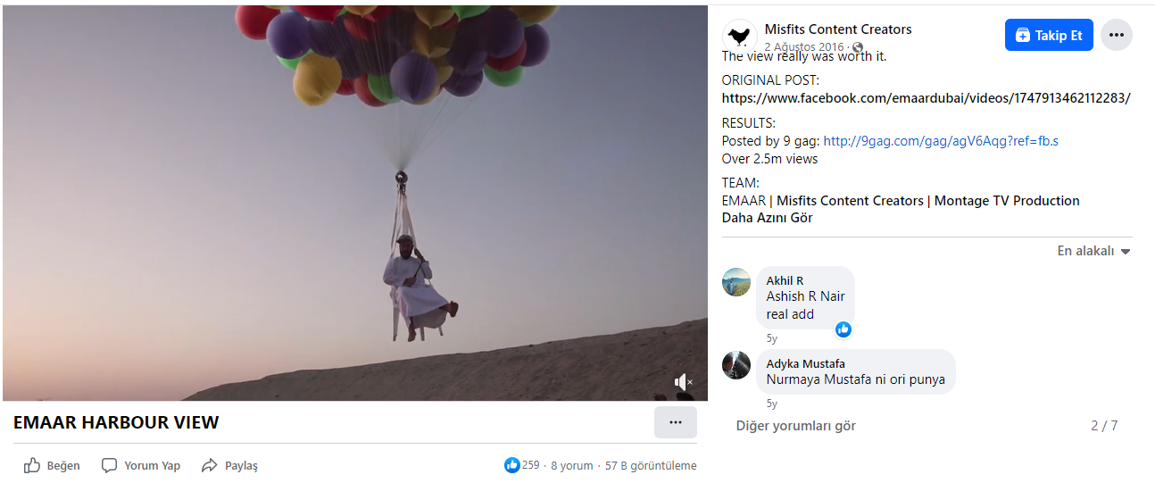 Videonun sonunda yazan yazıda ise, “Yakında bu manzara senin olabilir” ifadesinin yer aldığı görülüyor. Videonun açıklamasına baktığımızda da ilgili içeriğin Dubai’de bulunan Emaar emlak firmasının Dubai Creek Harbour isimli konut projeleri için çektiği reklam filmi olduğu anlaşılıyor.