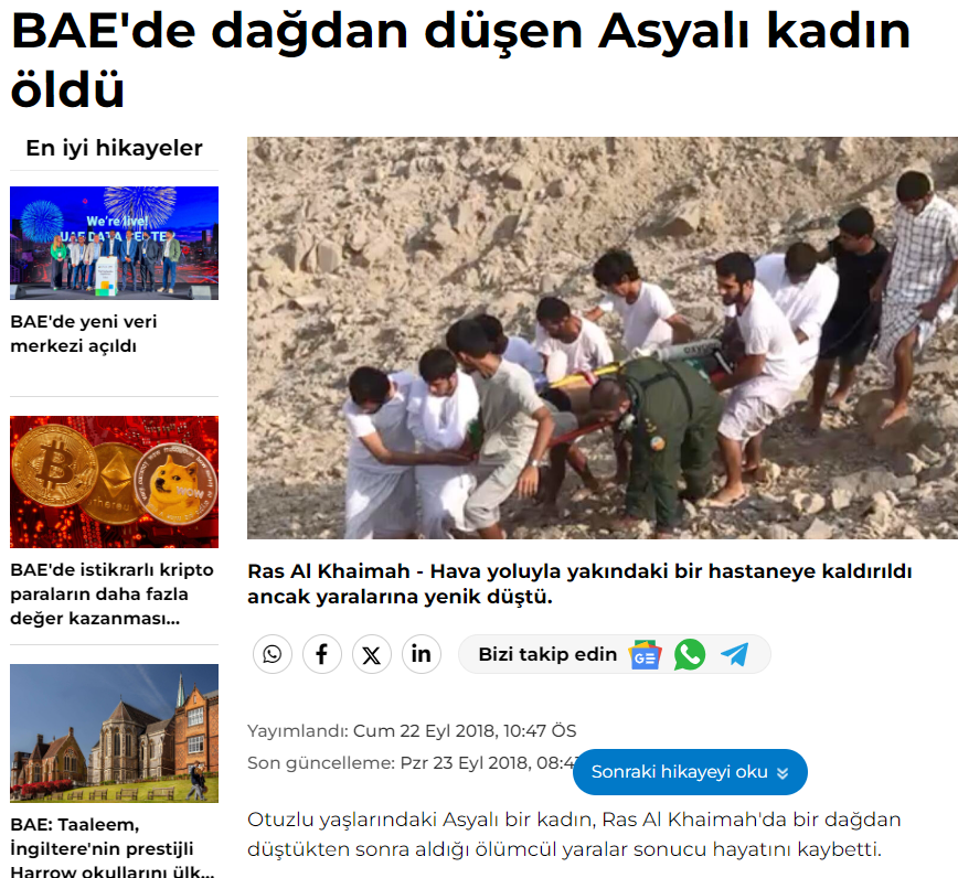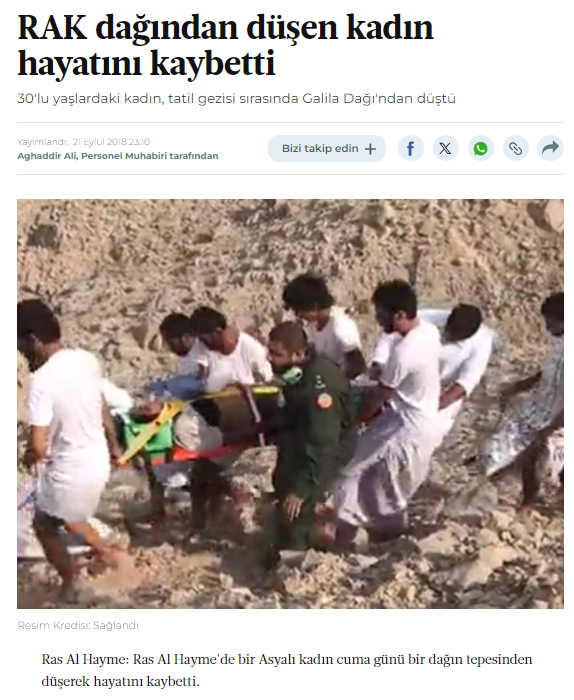 Khaleej Times tarafından bildirilen haberde, 22 Eylül 2018’de otuzlu yaşlarındaki Asyalı bir kadının Ras Al Khaimah’da dağdan düştükten sonra aldığı ağır yaralar sonucu hayatını kaybettiği bilgisi yer alıyor. Görüntüler ise kadını kurtarma operasyonunu gösteriyor.