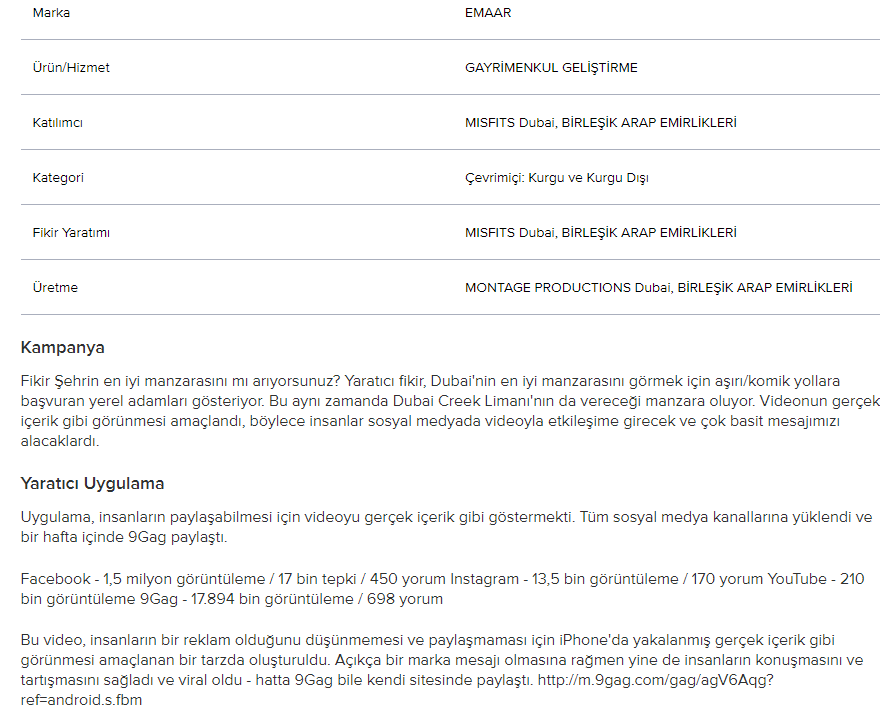 Öte yandan bu sitede yer alan bilgilere göre Emaar markasının, çevrimiçi olarak neredeyse hiç etkileşim alamıyor ve önceki videolarıyla başarı elde edemediği bu sebeple tamamen farklı bir şey yapmak istedikleri belirtilmiş.
