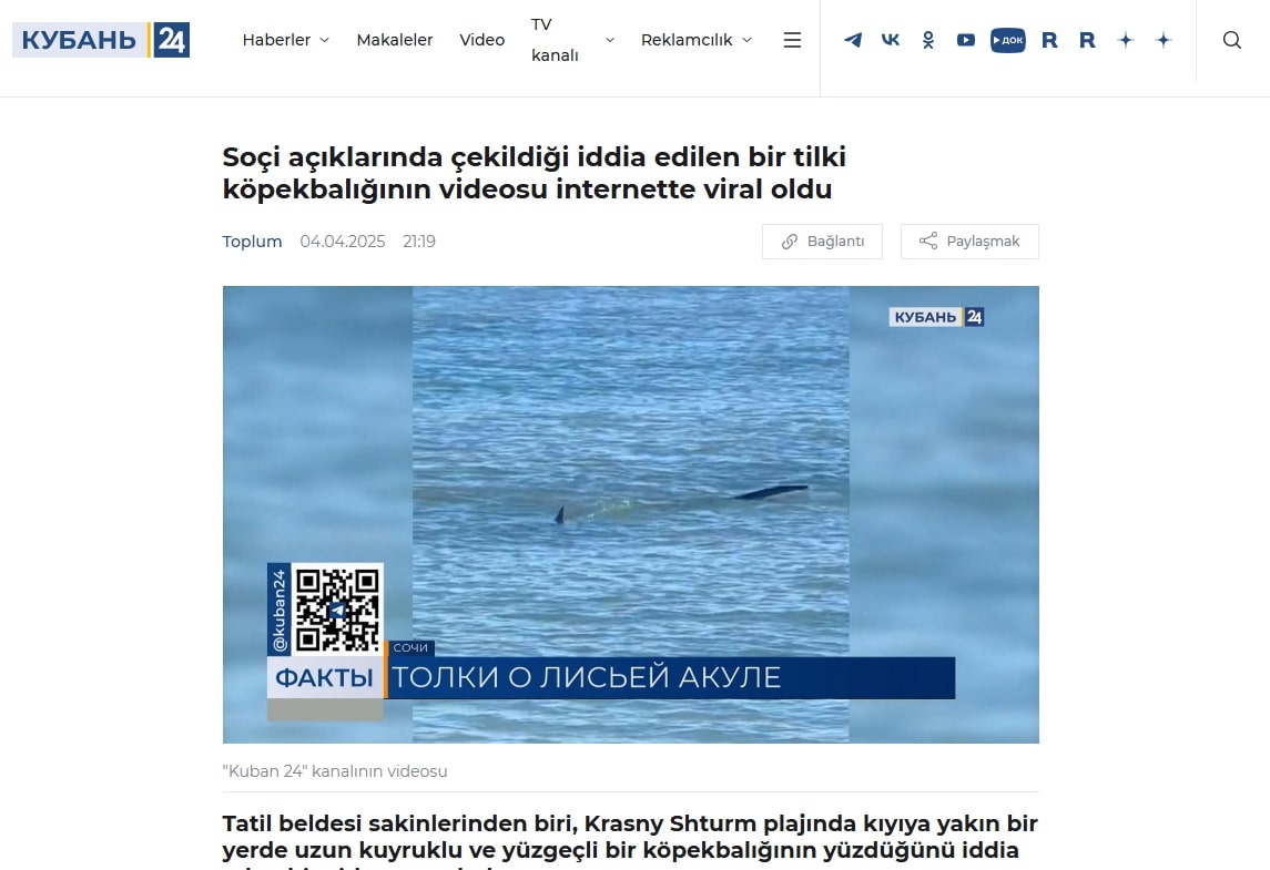 Soçi News tarafından 3 Nisan 2025 tarihinde yayımlanan haberde, iddia videosunu kullanarak Soçi kıyılarında harman bir köpekbalığının görüntülendiği belirtmiş.