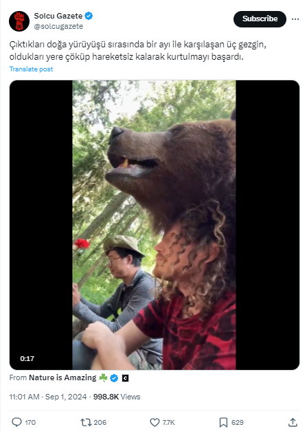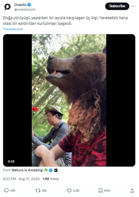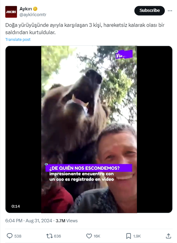 Sosyal medya platformu X’te, 31 Ağustos 2024’te paylaşılan bir videoda doğa yürüyüşü yapan üç kişinin vahşi bir ayıyla karşılaştığı anlar görüntülendi. Videoya eklenen paylaşım notlarında, bu kişilerin ayıdan ‘hareketsiz kalarak’ kurtulduğu iddia edildi.