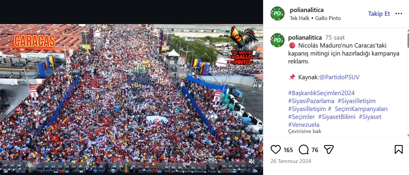 Videodan ekran görüntüsü alıp tersine görsel tarama metodunu kullanarak araştırmamıza başladık. Listelenen sonuçlara göre video 2024 yılında Maduro’nun başkanlık seçimlerinde yeniden seçilmek için yürüttüğü kampanyasını kapattığı Caracas’ta büyük bir mitingi gösteriyor.