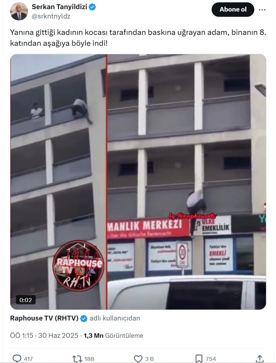 Sosyal medyada viral olan bir video, yanına gittiği kadının kocası tarafından baskına uğrayan adamın binanın 8. katından kaçtığı anları gösterdiği iddiasıyla paylaşıldı.
