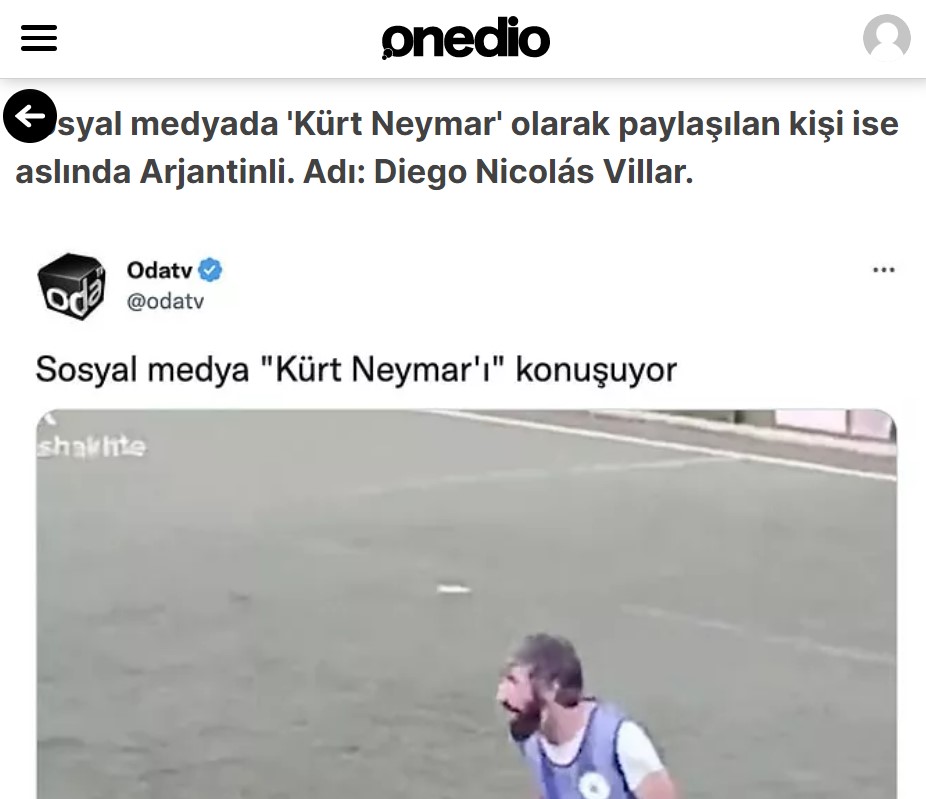Geçtiğimiz günlerde sosyal medyada bir futbolcunun sahadaki yeteneklerini sergilediği video gündem oldu. Yeteneği sayesinde videodaki kişiyi Brezilyalı futbolcu Neymar’a benzeten sosyal medya kullanıcıları, ayrıca videodaki kişinin Kürt olduğunu iddia ederek ona ‘Kürt Neymar’ lakabını taktı. ‘Kürt Neymar’ ismiyle pek çok yerde paylaşılan video bazı haber sitelerinde konu başlığı olarak da geçti. Videoyla ilgili ortaya atılan iddialar bununla sınırlı kalmadı. Bazı internet sitelerinde futbolcunun Diego Nicolás Villar olduğu iddia edildi.