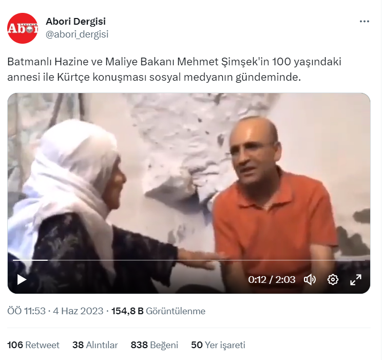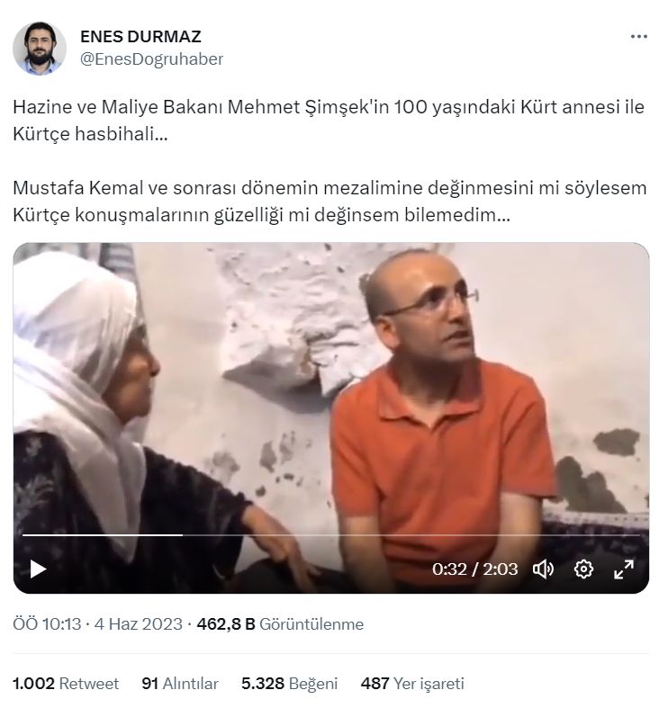 Hazine ve Maliye Bakanı Mehmet Şimşek ile Kürtçe konuşan bir kadının görüntüleri sosyal medyada pek çok kullanıcı tarafından paylaşıldı. Görüntüdeki kadının Mehmet Şimşek’in annesi olduğu iddia edildi.