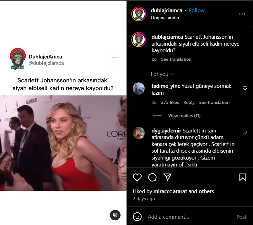 Geçtiğimiz ocak ayında iddianın yeniden yayılması üzerine sosyal medyada yapılan paylaşımlar arasında Johansson’un kırmızı halı röportajının farklı açıdan kaydedilmiş görüntüleri de mevcut. Bu görüntülerde arkadan geçen kadının mistik bir şekilde kaybolmadığı açıkça görülüyor.
