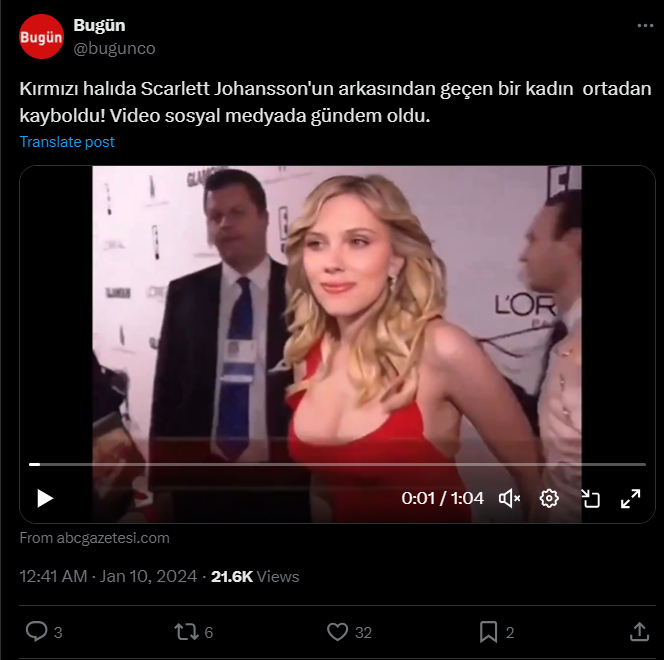 Geçtiğimiz günlerde sosyal medyada Scarlett Johansson’un kırmızı halıda kaydedilmiş bir videosu viral oldu. Videonun viral olmasının sebebi Johansson’un arkasında görünen kadının bir anda kaybolmasıydı. Görüntü araştırıldığında videonun geçtiğimiz aylarda da aynı iddiayla paylaşıldığı görülüyor.