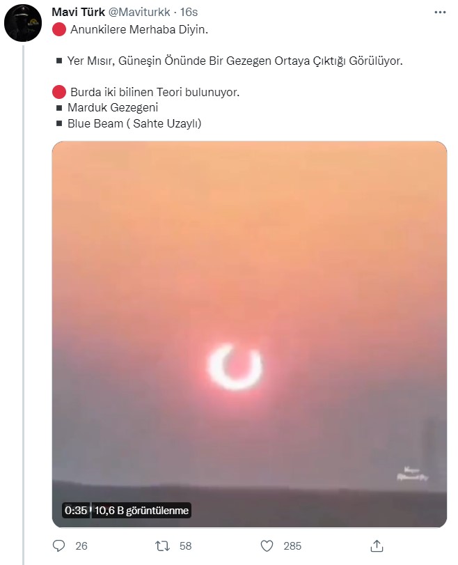 Bugün inceleyeceğimiz paylaşım ise bu gökyüzü şekilleriyle ilgili. Bir Twitter kullanıcısı, attığı videolu Tweet’te Güneş’in önüne “Marduk” isminde bir gezegenin geçtiğini ya da “uzaylı teknolojisi” olduğunu iddia ediyor. Bunu inceledik.