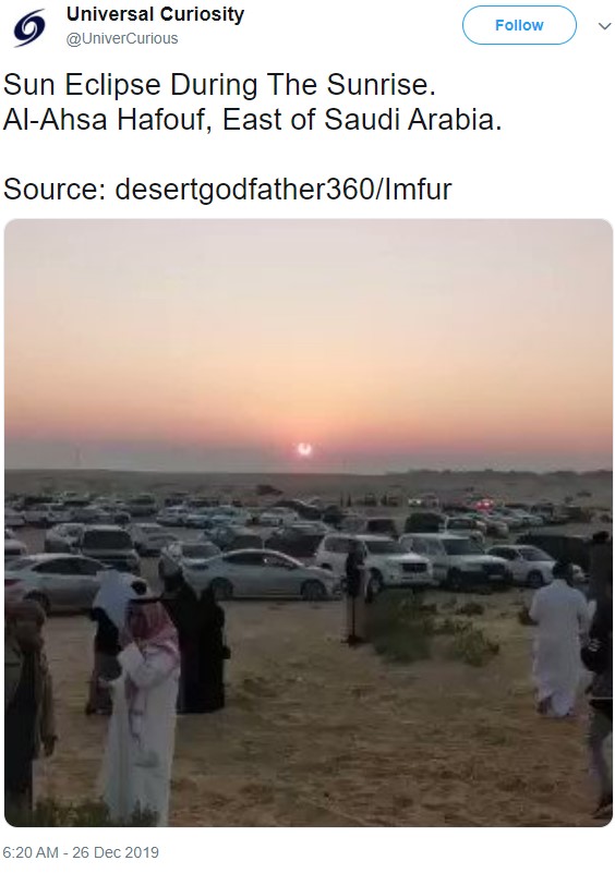 Video, 26 Aralık 2019’da Dünya’nın birçok yerinden gözlemlenebilen Güneş tutulması olayına ait. Aynı dönemde birçok haber sitesinde buna benzer fotoğraflara ulaşmak mümkün. Suudi Arabistan haber sitesi Arab News’in de bu haber okunabilir.