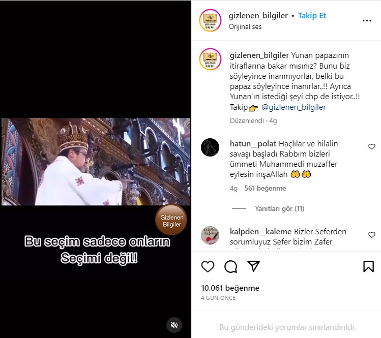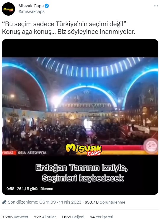 2023 seçimleri yaklaşırken, doğrulanması yapılmamış siyasi paylaşımların sayısı da artıyor. Twitter, Facebook ve Instagram gibi sosyal medya platformlarında binlerce etkileşim alan bir video dolaşımda. İlgili videoda Yunan bir papaz olduğu belirtilen kişi, Türkiye seçimleri ile alakalı şu ifadeleri kullandığı iddia ediliyor: