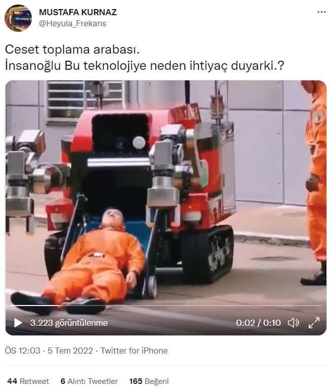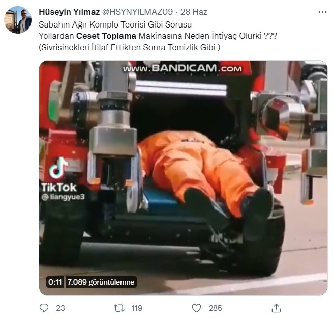 Geçtiğimiz günlerde sosyal medyada paylaşılan bir videoda görülen aracın, bir ‘ceset toplama robotu’ olduğu iddia edildi. Video Twitter’ın yanı sıra Facebook’ta da yayılım gösterdi.
