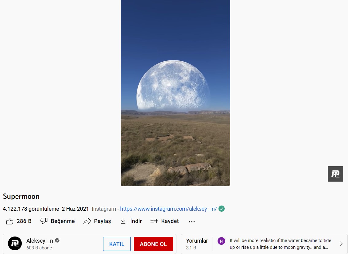 Videonun aslına baktığımızda, Aleksey__n (Aleksey Patrev) isimli YouTube onaylı bir kullanıcı tarafından paylaşıldığını görüyoruz. Aleksey, bir CGI sanatçısı ve portfolyosunda bu ve buna benzer birçok dijital çalışma bulunmakta.