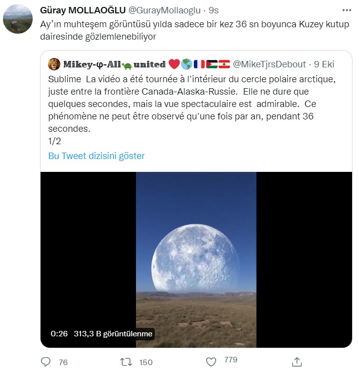 Sosyal medyada yayılan bir videoda, devasa boyutlarda doğan ay, Güneş’in kısa süreliğine önüne geçip Güneş tutulmasına yol açıyor. Paylaşım sahibi Ay’ın Kuzey Kutup Bölgesi’nde yılda yalnızca 36 saniye saniyeliğine görülebileceğini iddia etmiş.