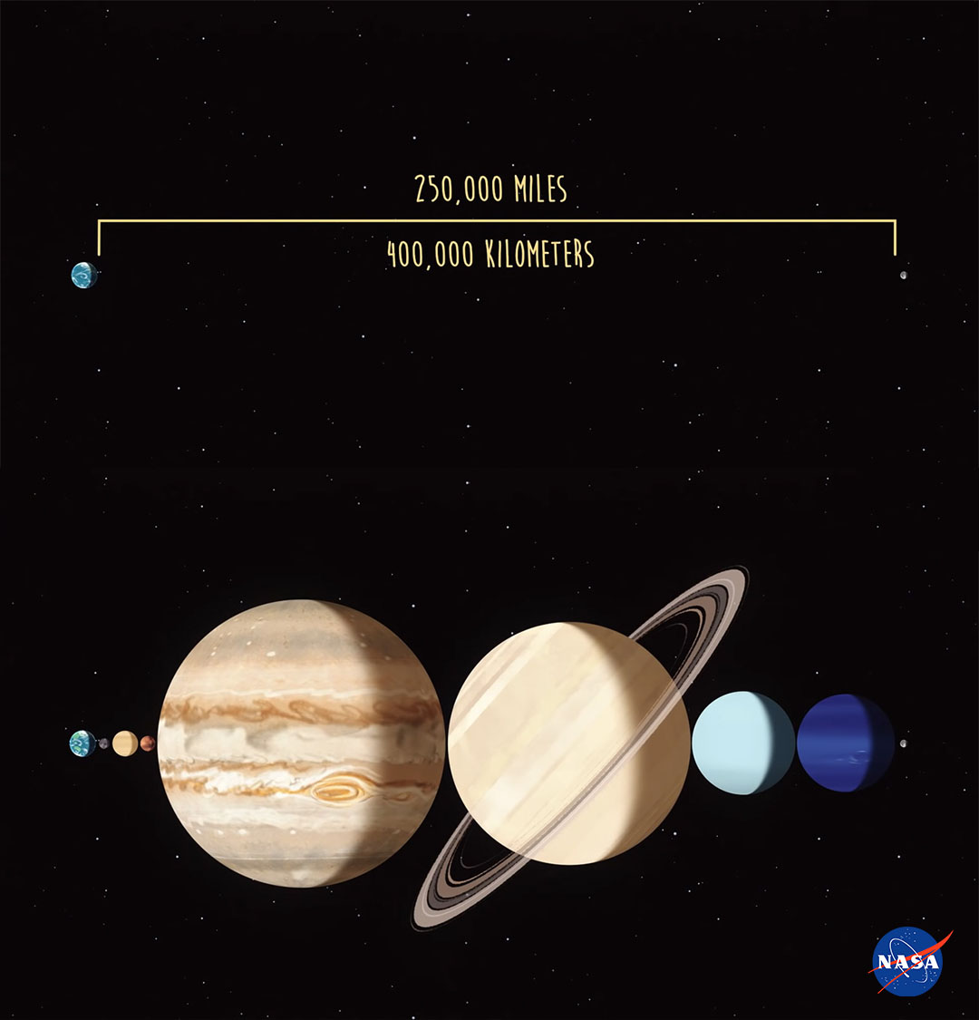 Ay, dünyaya yaklaşık 400 bin km uzaklıkta bulunuyor. Bu öylesine büyük bir uzaklık ki, Ay ile Dünya arasına güneş sistemimizdeki bütün gezegenler sığabilir.