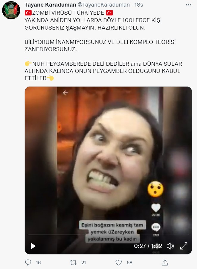 Aşı ve virüslerle alakalı dezenformasyonlar hız kesmeden devam ediyor. Aşı karşıtlığı ve komplo teorisyenliği yaptığı bilinen bazı çok takipçili hesapların paylaştığı bir videoda, psikolojik olarak normal olmayan birtakım hareketler sergileyen bir kadın görülmektedir. Kadın için bir “zombi” olduğu ve yakında bu zombi virüsünün ülkede yayılma göstereceği belirtilmiştir, ayrıca aşılarla alakalı olabileceği teorisi üzerinde de durulmuştur. Kulağa bilimsel gelmeyen bu iddianın perde arkasında ne olduğunu inceledik.