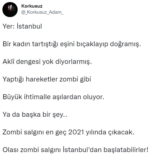 Dezenformasyon içeren ve yayılımda olan “zombi virüsü” paylaşımlarıyla kimi zaman karşılaşmaktayız. Peki zombi virüsünün patlak verme ihtimali bilimsel olarak mümkün mü? Zombi kıyamet senaryosu, edebi eserlerde ve sinema filmlerinde ele alınmaktadır. Gelgelelim sinir sistemini tamamıyla kontrolsüz bırakan ve bedeni insan şeklinden çıkarıp yarı ölümsüz bir hale getiren bir virüs, mevcut bilim dahilinde mümkün değil.