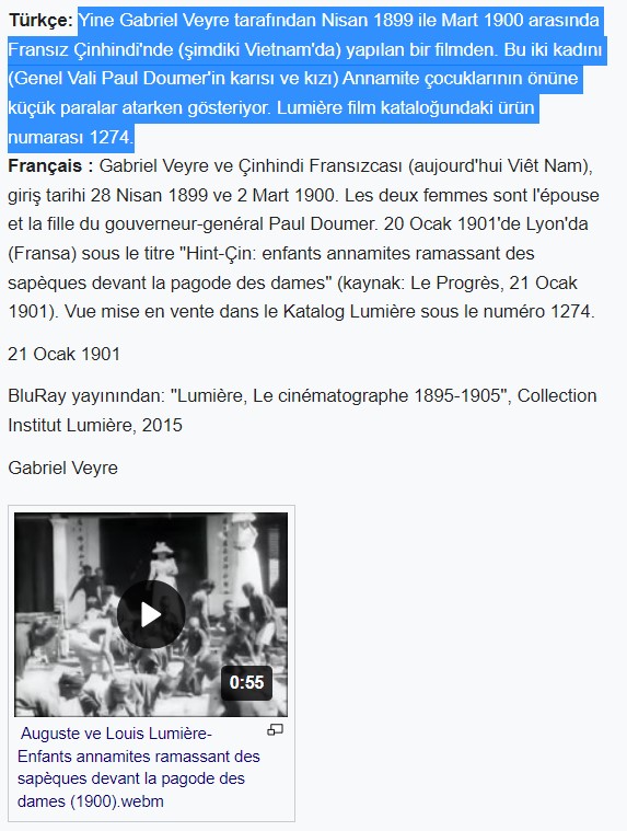 Görüntü, Gabriel Veyre tarafından 28 Nisan 1899 ve 2 Mart 1900 arasında Fransız Çinhindi’nde (şimdi Vietnam) çekilen bir filmden alıntı. İki kadın, Genel Vali Paul Doumer’in karısı ve kızıdır. Bu film 20 Ocak 1901’de Lyon’da (Fransa) “Hint-Çin: Annamite çocukları bayanlar pagodasının önünde bozuk para topluyor” başlığı altında gösterildi