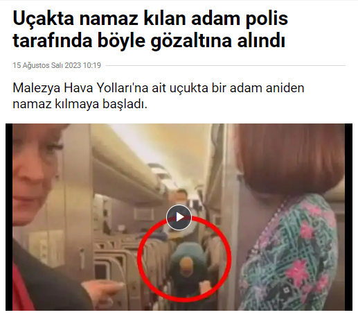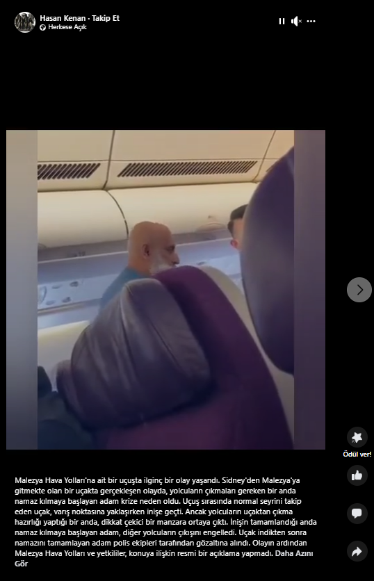 14 Ağustos 2023’te Avustralya’dan Malezya’ya giden bir uçağın acil durum dolayısıyla Sidney’e geri dönmesi üzerine sosyal medyada konuyla ilgili görüntüler ve iddialar paylaşıldı. Bu görüntülerden birinde uçakta bir kişinin namaz kıldığı görülüyordu. Görüntülere ‘uçakta namaz kıldı, polis gözaltına aldı’ gibi başlıklar eklendiği için; paylaşımlar, kişinin uçakta namaz kıldığı için gözaltına alındığı algısına yol açtı.