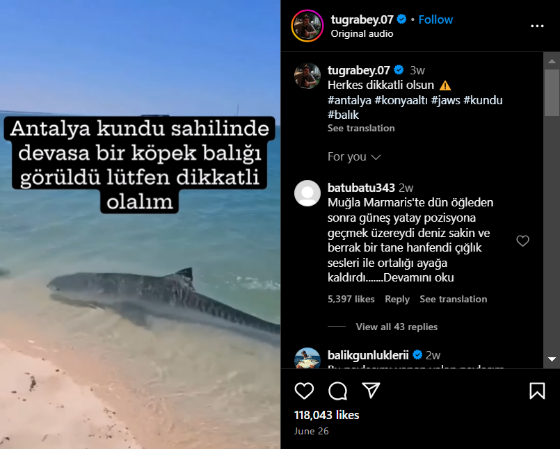 26 Haziran 2024’te sosyal medyada paylaşılan bir videoda Antalya’nın Kundu sahilinde köpek balığı görüldüğü iddia edildi. 118 bin beğeni ve 25,2 milyon izlenme alan video, izleyicilerde endişe uyandırdı; çünkü videoda köpek balığı sahile epey yakın geziyordu. Paylaşıma eklenen ‘lütfen dikkatli olalım’ ve benzeri notlar da endişeyi artırdı.