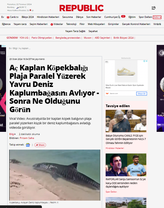 Videodan alınan ekran görüntüsü tersine aratıldığında 25 Ocak 2024 tarihli Republic World ve The Irish Sun makalelerine ulaşıyoruz.