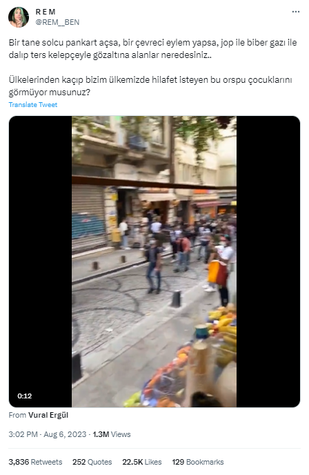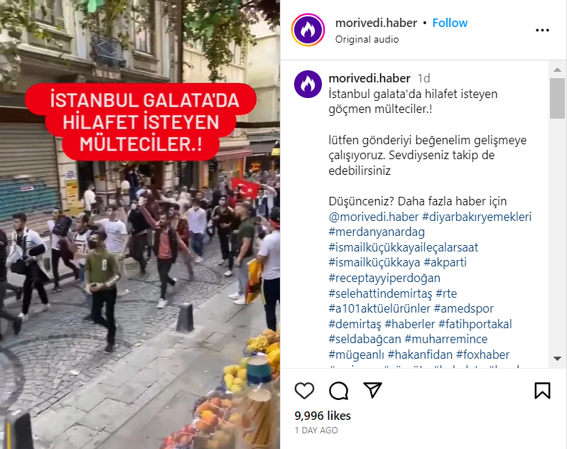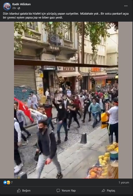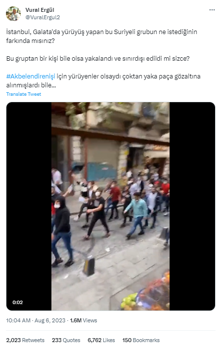 6 Ağustos 2023’te sosyal medyada paylaşılan bir video ile Suriyeli sığınmacıların ‘hilafet çağrısında’ bulunduğu iddia edildi. İddiaya konu edilen videoda bir grubun slogan atarak yürüdüğü görülüyor. Ayrıca iddiaya ek olarak, atılan sloganın ‘Payitaht, Hilafet, Resulümüz Muhammed’ olduğu da ifade edilmiş.