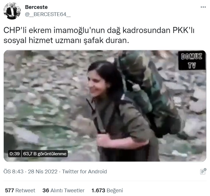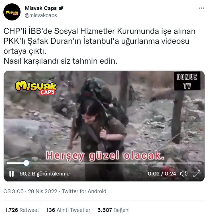 Twitter’da Misvakcaps’in gösterdiği videoda, eli silahlı bir kişinin, Şafak Duran olduğu ve dağda çekildiği anlaşılan görüntülerde, ilgili kişinin ‘İBB’ye gidiş anını’ gösterdiği iddia edilmişti. :