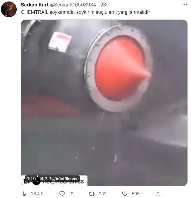 Twitter’da bir kullanıcının paylaştığı video kısa sürede viral oldu. Söz konusu görüntülerde bir uçağın kimyasal bir gaz püskürttüğü iddia edildi. Bu iddia “chemtrails” olarak bilinen ve hakkında daha önce bazı analizler ve bir inceleme yazısı ele aldığımız yaygın bir komplo teorisini yaymak amacıyla paylaşılmış.