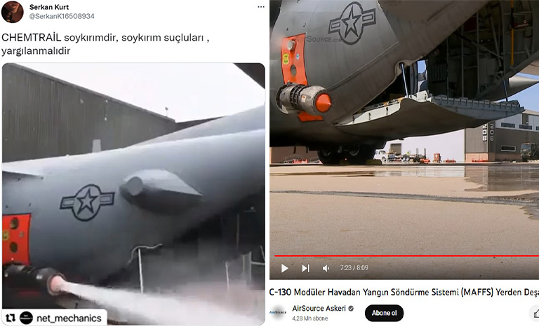 Chemtrails etiketiyle paylaşılan söz konusu videoda bir hava taşıtının pervanesinden ne olduğu anlaşılmayan bir sıvı püskürtülüyor. Bir sonraki sahnede bu sefer havadaki bir uçağın kesikli bir şekilde sıvı püskürttüğü görülüyor. Videoda bu taşıtın ne olduğuna dair herhangi bir bilgi verilmemiş. Sol altta bulunan video kaynağı olan “net_mechanics” ismini Google’da aramakla işe başlıyoruz.